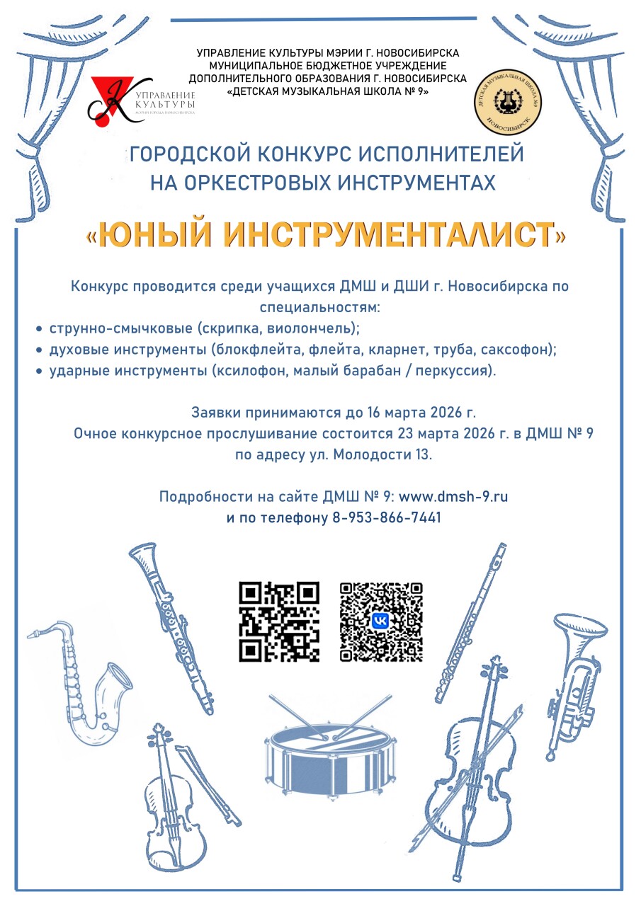 Детская музыкальная школа №9 приглашает принять участие в городском конкурсе исполнителей на оркестровых инструментах «Юный инструменталист».