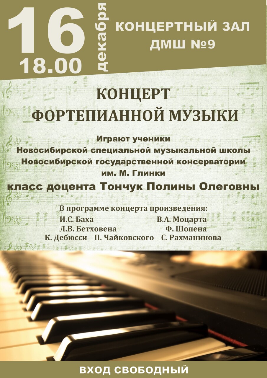 Совсем скоро в концертном зале нашей школы состоится особое событие — у нас выступят учащиеся Новосибирской специальной музыкальной школы и Новосибирской государственной консерватории им. М. Глинки, класс доцента Тончук Полины Олеговны.