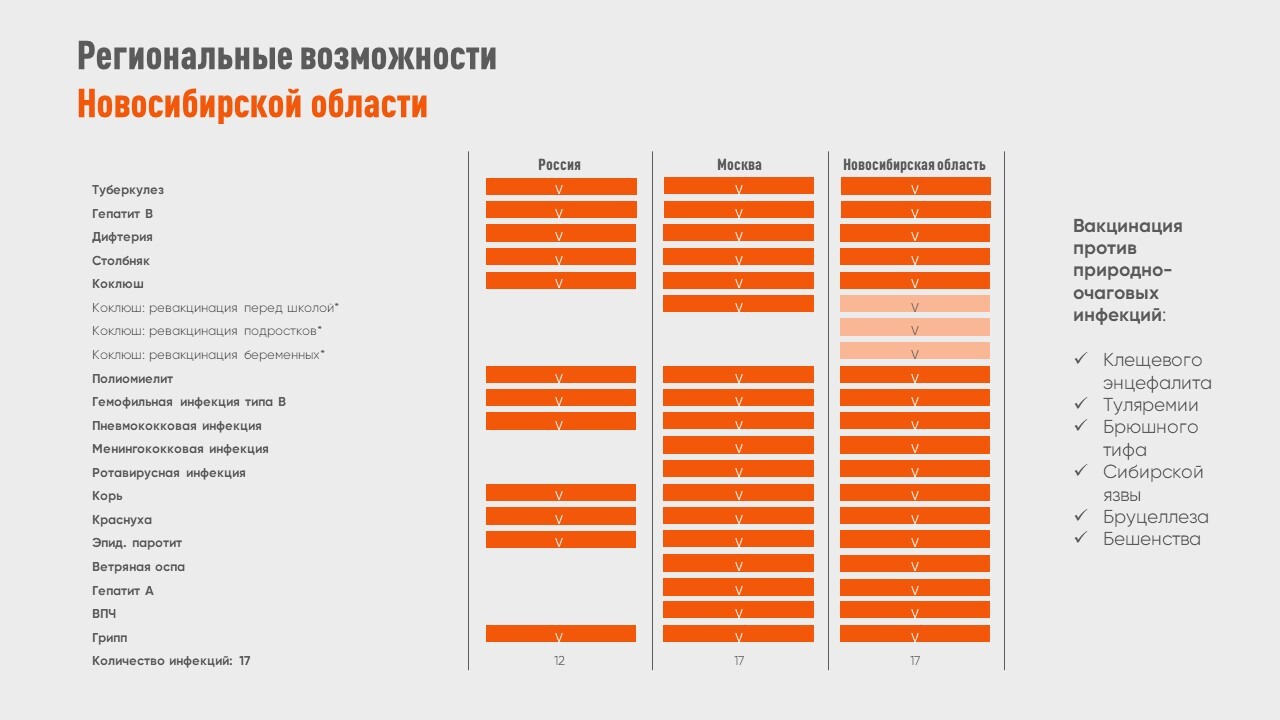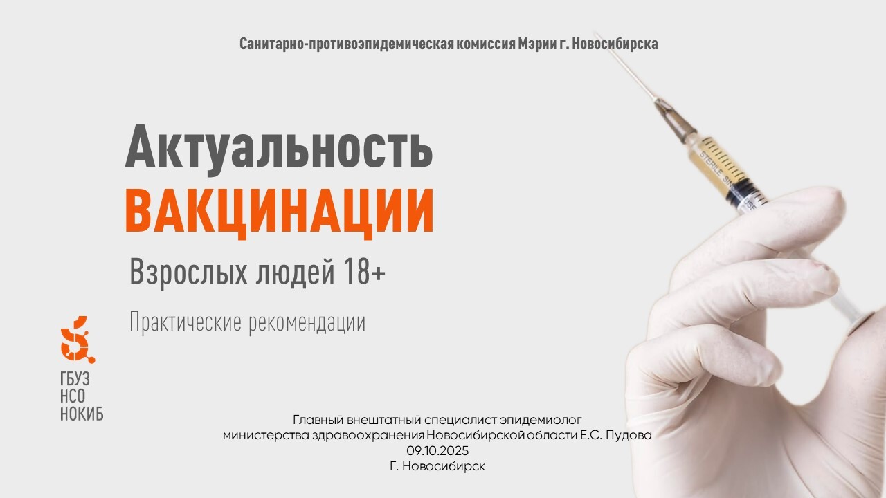 Санитарно‑противоэпидемическая комиссия мэрии г. Новосибирска и главный внештатный специалист‑эпидемиолог министерства здравоохранения Новосибирской области Е. С. Пудова предлагают познакомиться с презентацией «Актуальность вакцинации взрослых людей 18+».